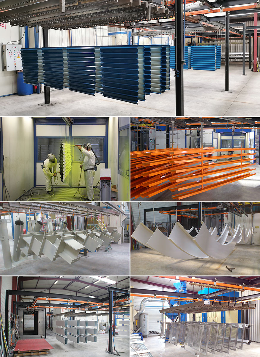 Nous appliquons la peinture en poudre au pistolet dans nos cabines de poudrage manuel conçues afin de recevoir de grandes surfaces